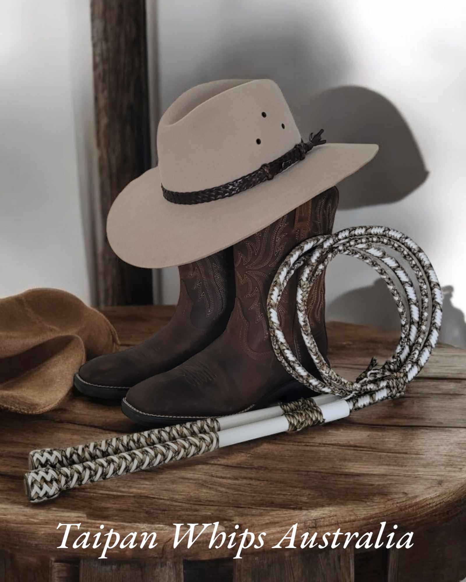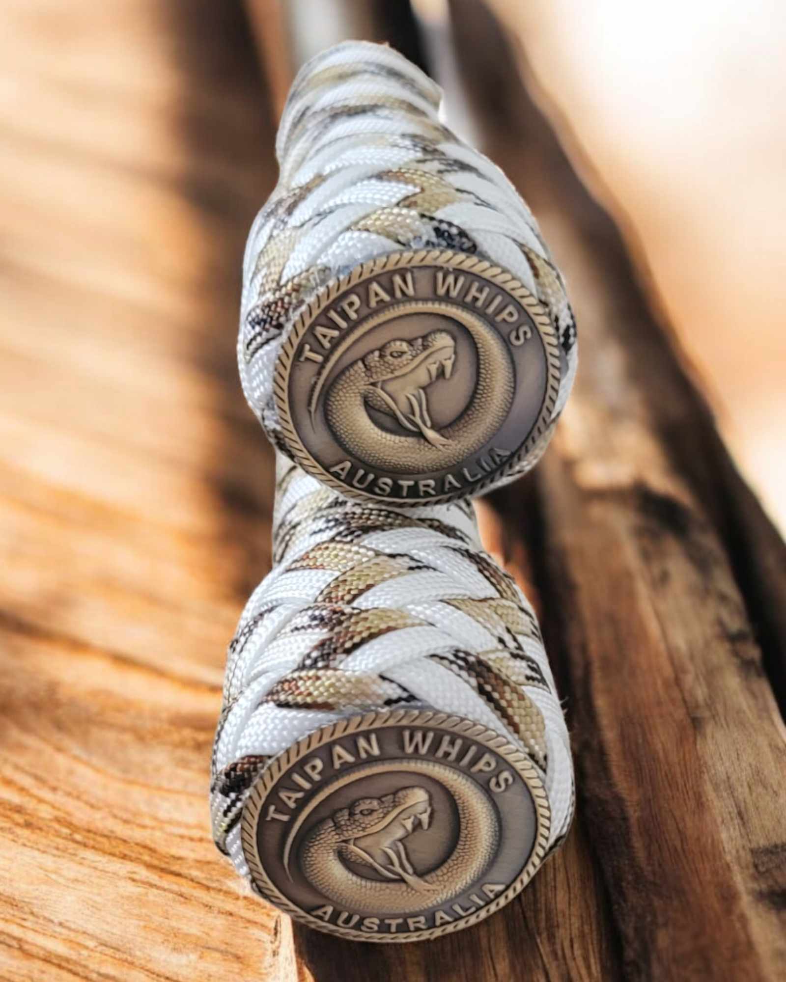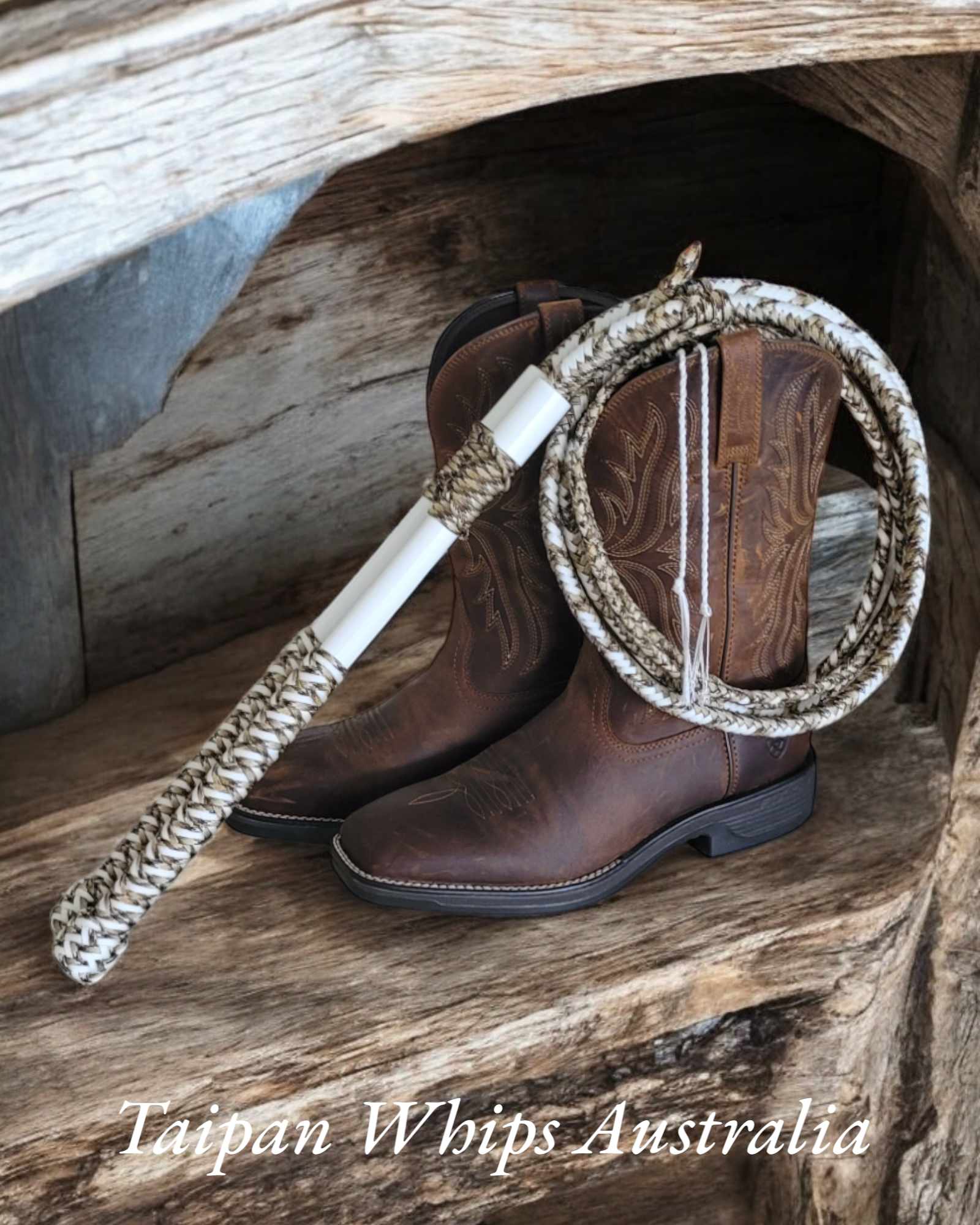 This eye catching matched pair of 5 Ft Performance Hybrid Whips has been plaited in White & Smores cords. A great set of whips that performs well.